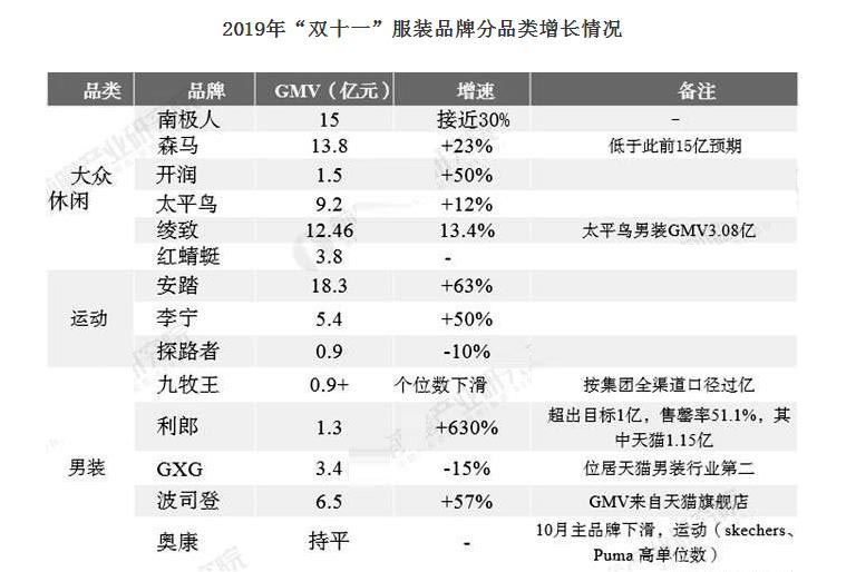 分品牌来看,2019年各企业双十一GMV数据。其中大众休闲品类:南极人、森马、绫致三家企业GMV均超过10亿元;运动品类中,安踏GMV高达18.3亿元,同比上年增长63%;男装品类中,各企业GMV普遍较低。