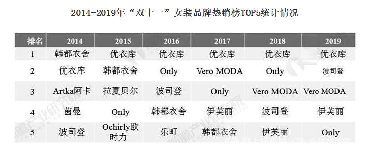 此外,从女装销量来看,2019年双十一女装品牌热销榜TOP5为优衣库、波司登、Vero MODA、伊芙丽、Only。值得注意的是,大品牌服装企业在今年的双十一中表现亮眼,2019年波司登、伊芙丽分别排名第二和第四。而过去的电商品牌韩都衣舍、乐町、拉夏贝尔等企业则在逐渐淡出榜单。
